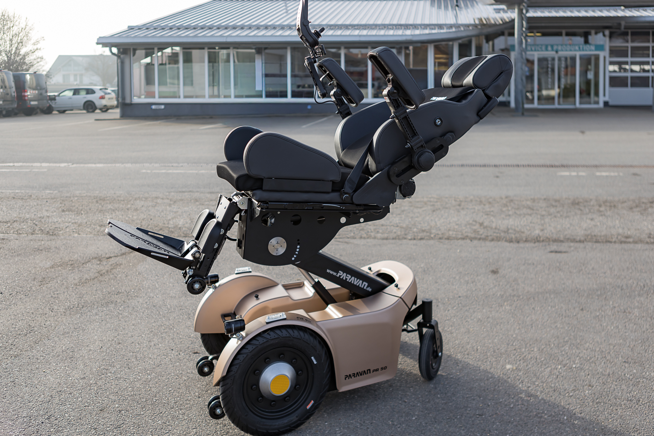 Der PR 50 ist bis heute Herzstück des Portfolios. Er verbindet Alltag, Therapie und selbstständiges Autofahren in einem System. Der Elektrorollstuhl ist im Hilfsmittelverzeichnis der gesetzlichen Krankenversicherung gelistet (HMV-Nr. 18.99.06.1048) und erfüllt als erster Rollstuhl zugleich die Anforderungen eines geprüften Autofahrersitzes nach § 35a StVZO. Seine elektrische Liftfunktion bringt den Nutzer auf Augenhöhe – am Arbeitsplatz ebenso wie im privaten Umfeld. Die Kantelfunktion unterstützt Druckentlastung und Sitzkomfort, fördert die Durchblutung und trägt zur Dekubitusprophylaxe bei. In Kombination mit der Paravan Dockingstation wird der Rollstuhl im Fahrzeug zum vollwertigen, geprüften Fahrersitz – ohne Umsetzen, ohne zusätzlichen Transfer.
