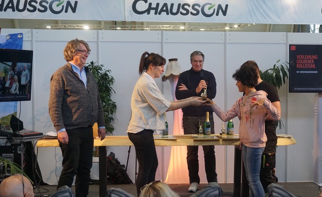 Marlene nimmt stolz den Goldenen Rollstuhl entgegen.